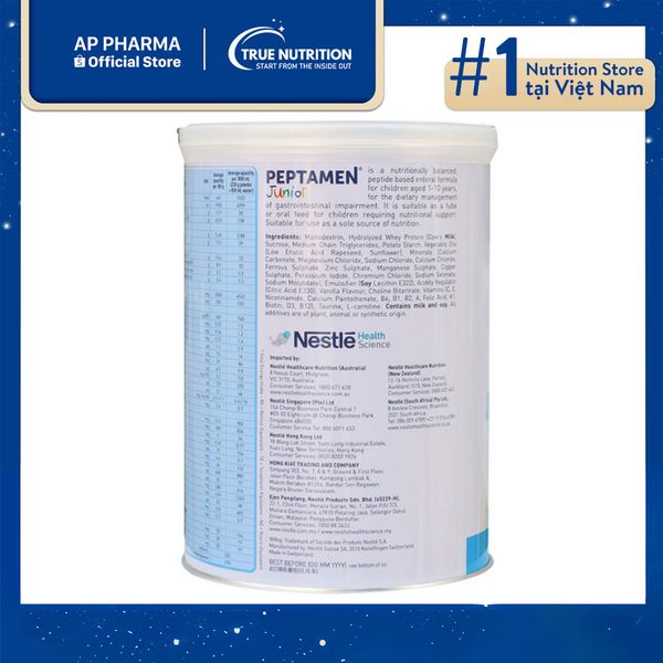 Peptamen Junior Nestlé là dòng sữa dinh dưỡng y học chuyên biệt dành cho trẻ em từ 1 đến 10 tuổi có vấn đề về tiêu hóa. Sản phẩm được phát triển bởi Nestlé Health Science, mang đến công thức tiên tiến với 100% đạm Whey thủy phân thành peptides, giúp trẻ tiêu hóa và hấp thu dưỡng chất một cách tối ưu. Với tỷ lệ chất béo MCT cao (51%) cùng các vitamin và khoáng chất thiết yếu, Peptamen Junior không chỉ hỗ trợ sự phát triển toàn diện mà còn giúp trẻ nhanh chóng phục hồi sức khỏe sau các bệnh lý tiêu hóa. Đặc biệt, sản phẩm rất phù hợp cho những trẻ bị suy giảm chức năng tiêu hóa, trẻ mắc hội chứng ruột ngắn, viêm tụy, và các tình trạng tiêu hóa khác.